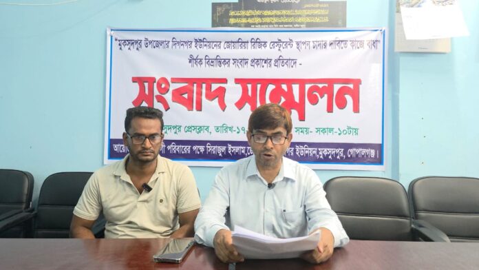 গোপালগঞ্জের মুকসুদপুর উপজেলার দিগনগর ইউনিয়নের জোয়ারিয়া গ্রামে জমি সংক্রান্ত বিরোধ ও “রিজিক হাইওয়ে ইন চাইনিজ এন্ড বাংলা রেস্টুরেন্ট স্থাপনে বাধা” বিষয়ক বিভ্রান্তিকর সংবাদ প্রকাশের প্রতিবাদে শুত্রুবার (১৭ এপ্রিল) সকাল ১০টায় মুকসুদপুর প্রেসক্লাব কার্যালয় ভুক্তভোগী সিরাজুল ইসলাম শেখ সংবাদ সম্মেলন করেছেন।