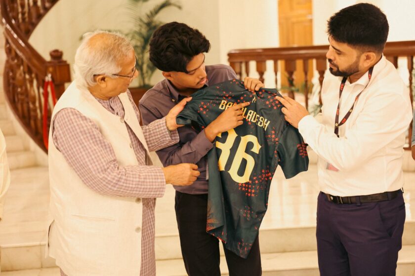 এসময় মেঘ তার নিজের ডিজাইন করা এরা একটি জার্সি ও ব‍্যাগ প্রধান উপদেষ্টাকে উপহার দেন।
